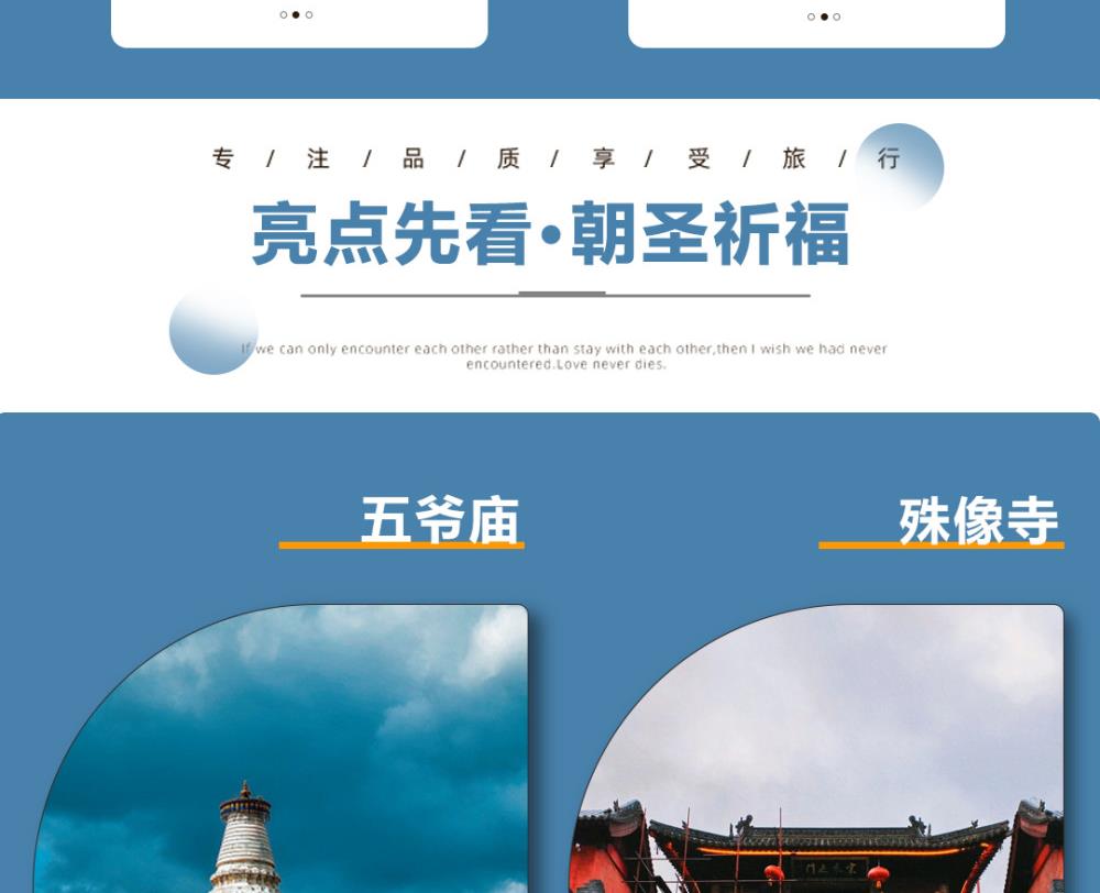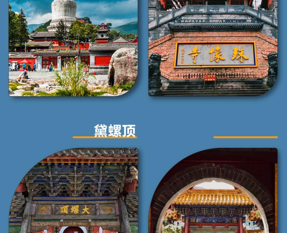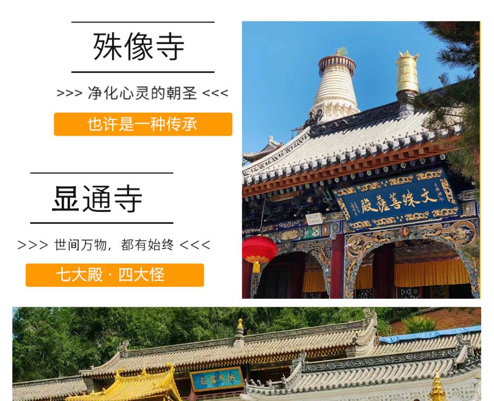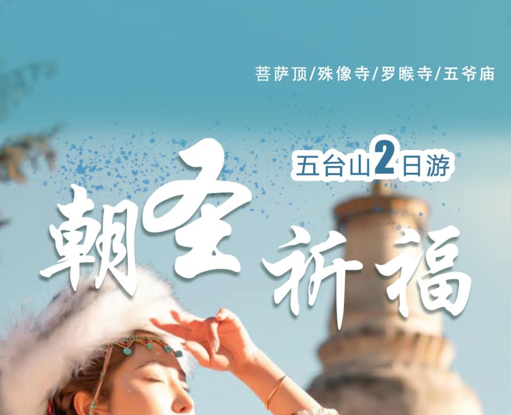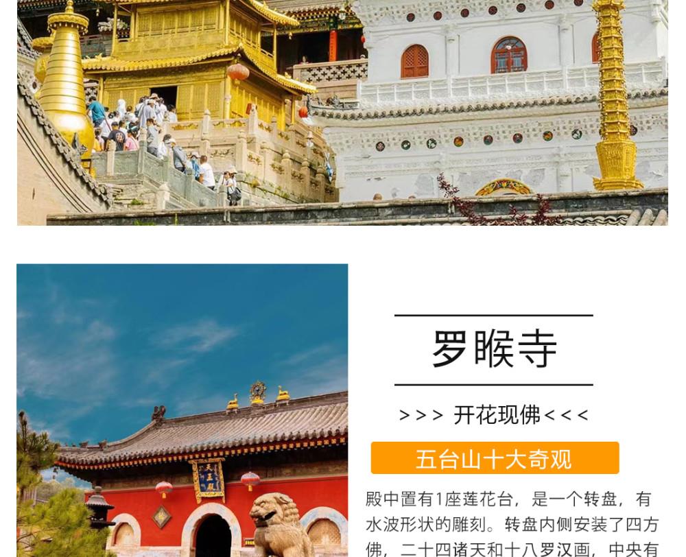 第一天:早指定时间地点集合,乘汽车赴五台山,抵达佛教圣地——【五台山】(自理进山费135元/人)游览【菩萨顶】(自费:10元/人,约1小时),菩萨顶是五台山最大的皇家寺院,素有“小布达拉宫”之称;游览广化寺(约50分钟),广化寺是佛主太子的所在地。外观五台山的标志“大白塔”所在地——塔院寺;游览【殊像寺】(约30分钟),殊像寺是文殊菩萨的祖庭;游览镇海寺(约40分钟),镇海寺是二龙戏珠的风水宝地,也是清朝顺治皇帝的出家院寺。