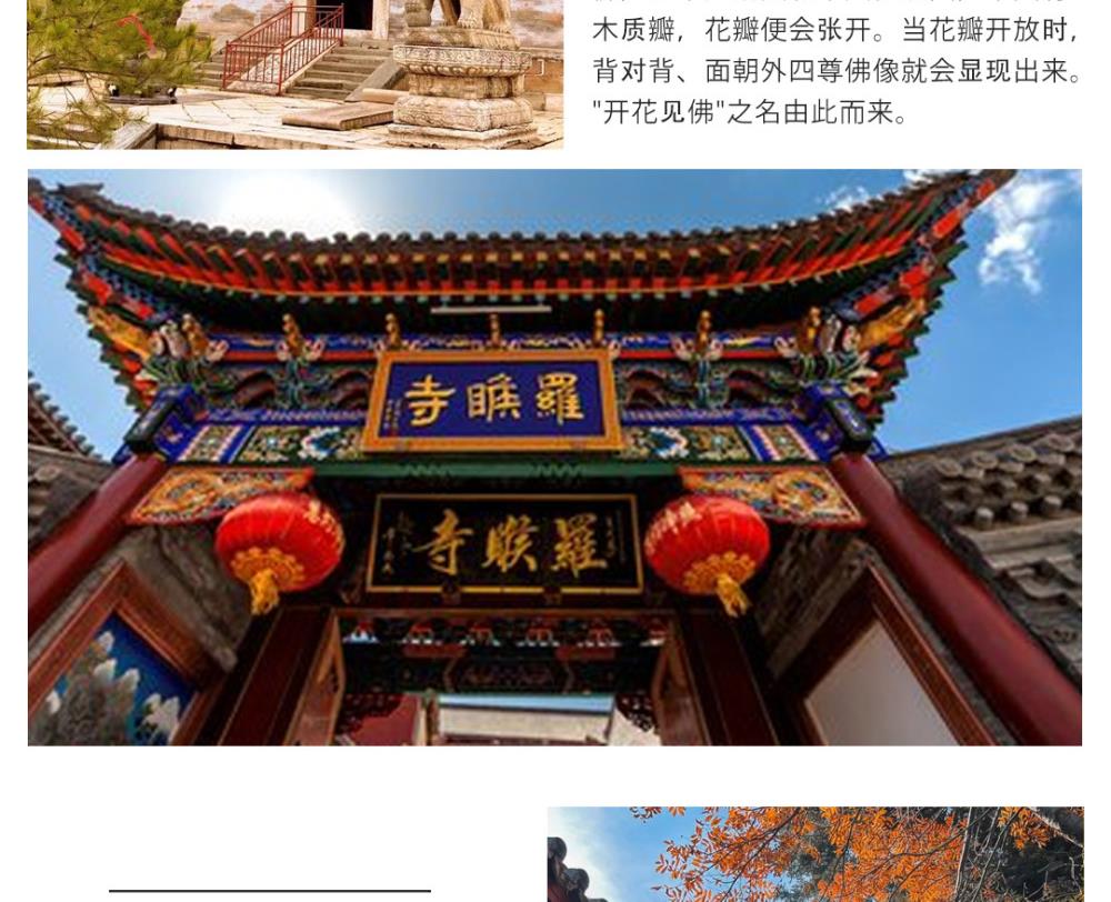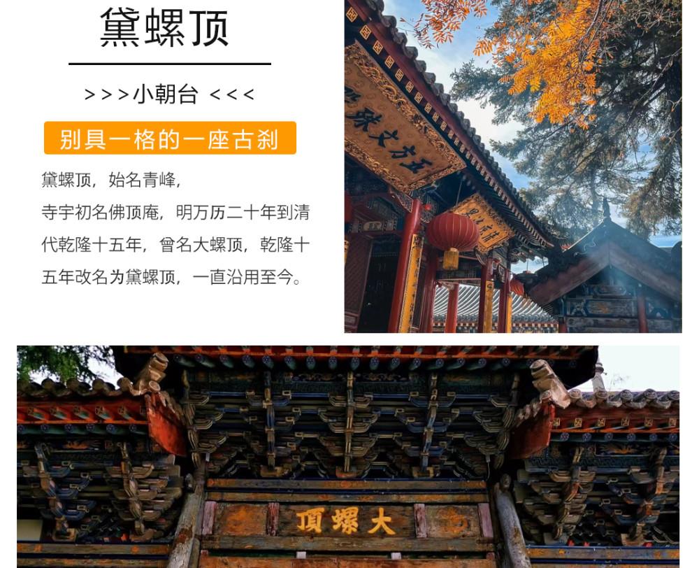 第二天:早餐后游览【黛螺顶】(自费:10元/人,约3小时),登大智路智慧台(1080台阶),参拜五方文殊,素有小朝台之称;游览【万佛阁】又名五爷庙(每逢初一、十五朝拜礼佛游客较多,停留时间适当调整约2小时),【万佛阁】是五台山香火最旺、许愿最灵的寺庙;随后游览【白云寺】(约50分钟),白云寺是五台山上建设最早规模最大的名刹古迹或参观北台顶脚下清修寺院----【宝华寺】绕西藏飞来塔,拜地藏王菩萨。
