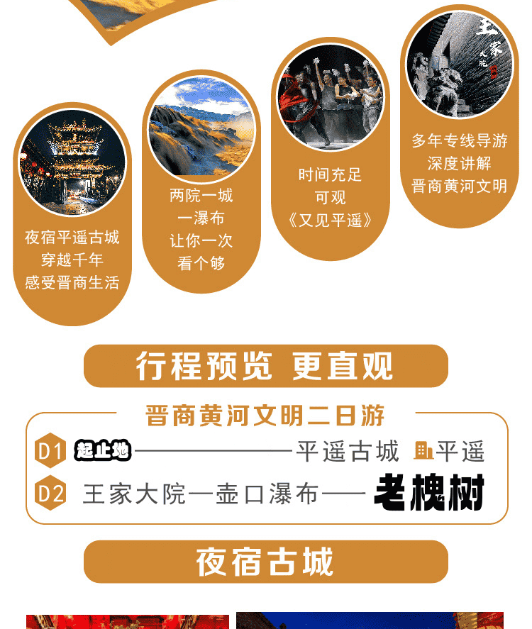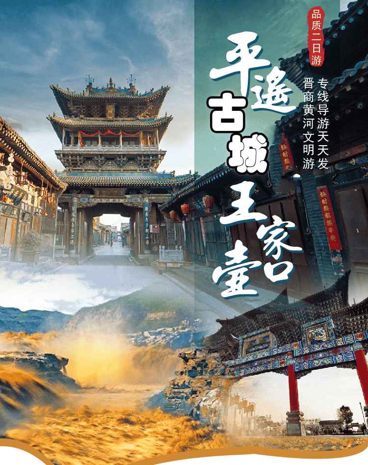 随后赴平遥古城,车程约2小时【平遥古城】免门票(景交30元自理,不含景区内专业讲解),平遥被称为“保存最为完好的四大古城”之一,也是中国仅有的以整座古城申报世界文化遗产获得成功的两座古城市之一。平遥非常热闹,衙门巡街、宫女巡游、花车巡游、晚上有灯光秀、各种花灯,您也可以在酒吧尽情放松自己,在温馨的古城惬意的度过属于你自己的时光;由于平遥古城属于开放性景点,游客都是自行游览,导游无法跟随敬请谅解; 游览结束后自行回酒店休息;