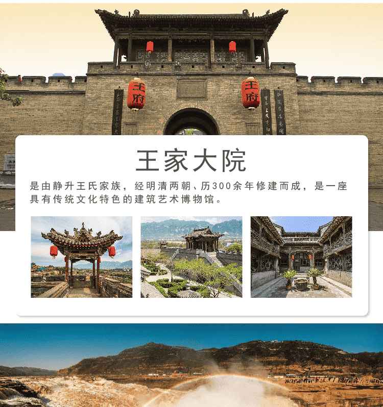 早上5:30左右指定地点集合出发赴山西灵石县游览传奇晋商精英“乔致庸”府邸—【王家大院】(王家大院门票自费,约2小时):参观高家崖、红门堡等建筑群,欣赏王家大院三雕艺术的精华(砖雕、木雕、石雕)感受昔日晋商王府地位之显赫。