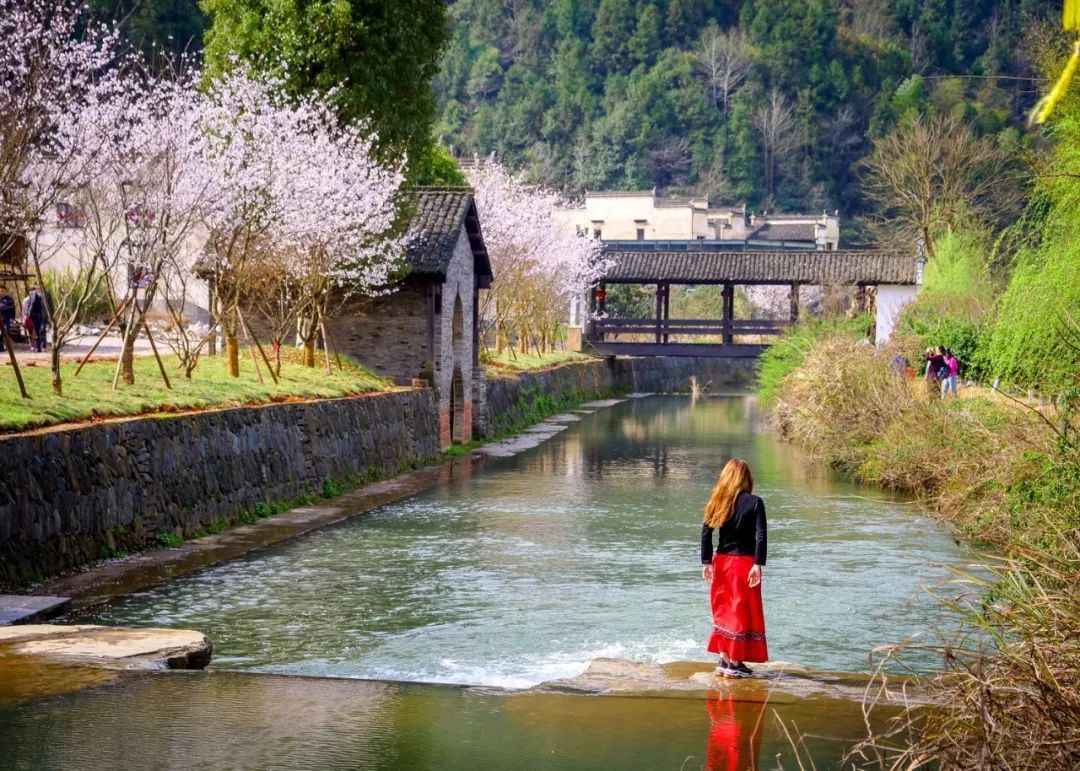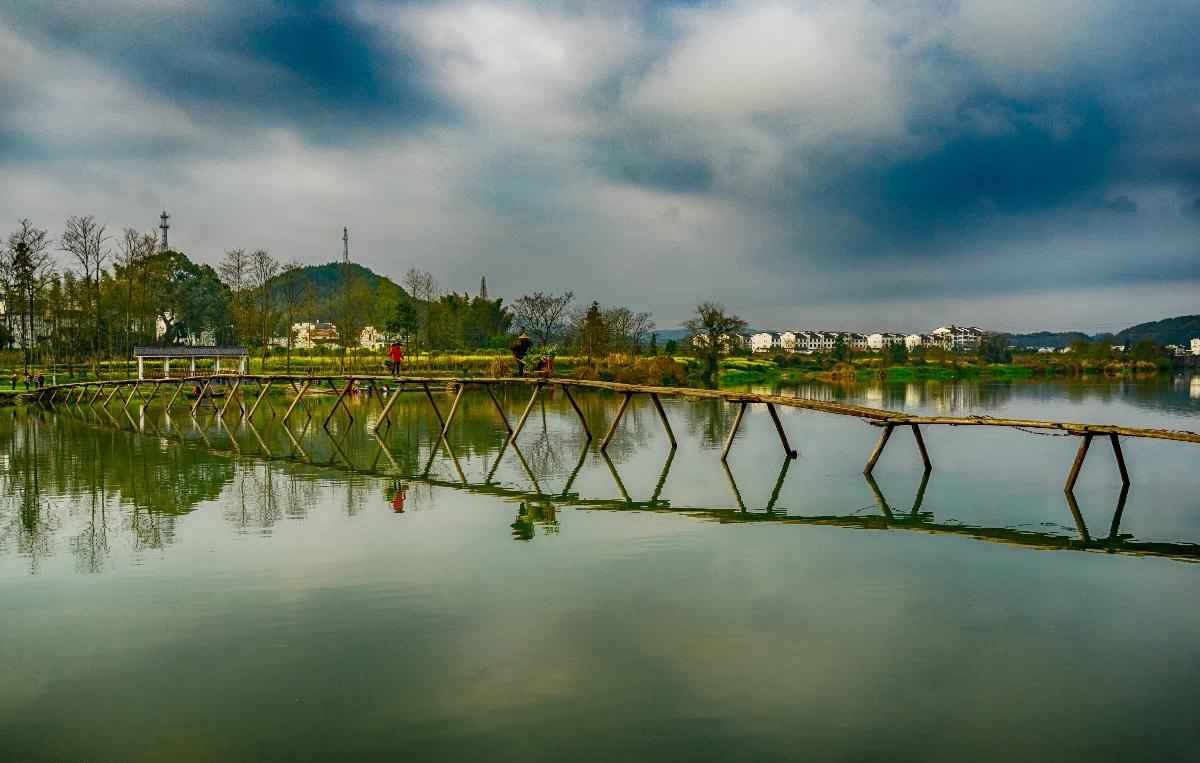 车赴游览田园牧歌 — 【漳村】, 坐落于中国最美的乡村 — — 婺源县思口镇, 它是重要的古 徽州水运码头之一, 美丽的漳溪河水绕村而过, 见证着漳村数百年的繁华 。漳村始建于南宋末年 ,在 清代全盛时期, 全村有 1000 多户人家, 它是婺源有名的官宦之村, 清代任七品以上官员就出过 100 多名 。漳村被称为“ 田园牧歌 ”式的地方 。 它的精髓就在于这里有一片幽静的河面, 河边有一大片绿 茵茵的草坪, 河上有一座长约五十余米的板凳桥, 被誉为中国最长板凳桥, 并屡屡在国内摄影大赛上 获奖, 是漳村最为有名的旅游形象符号 。 溪流如玉带, 青山如列阵, 草甸沙洲, 板桥樵人, 牧童水 牛, 渔夫竹筏, 无需任何修饰, 就是一 幅浑然天成的江南水墨画!