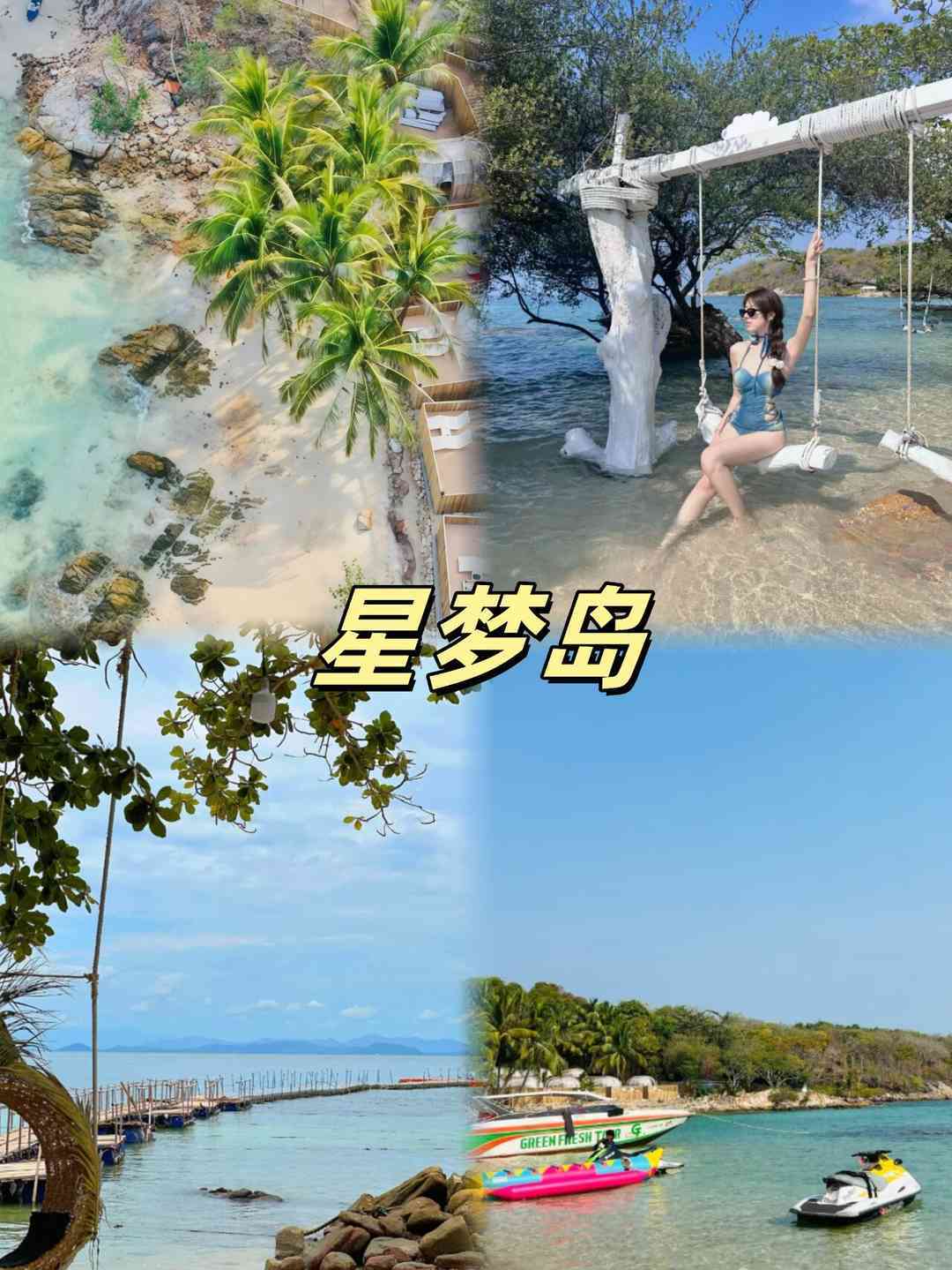 星梦岛以洁白的沙子和湛蓝色的海水而为名。也是泰国中部地区最美,最原生态的岛屿。无论您是寻求刺激还是温馨浪漫它都能满足你,在这里您可以尽情的享受阳光沙滩,沉浸在碧蓝的海水中。也可以自费参加:摩托艇、浮潜,海底漫步等。如果您喜欢冒险不妨尝试刺激的海底漫步让你心跳加速与五颜六色的热带鱼嬉戏。如果您喜欢安静也可以买个椰子躺在沙滩椅上静静的享受阳光沙滩。