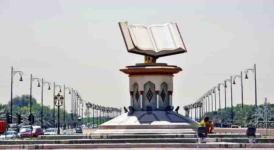 参观【文化广场/古兰经纪念碑】(外观):沙迦是中东地区的文化名称,而古兰经纪念碑广场则是沙迦的文化中心。文化广场又称古兰经广场,因广场中央的巨大古兰经雕塑而闻名。