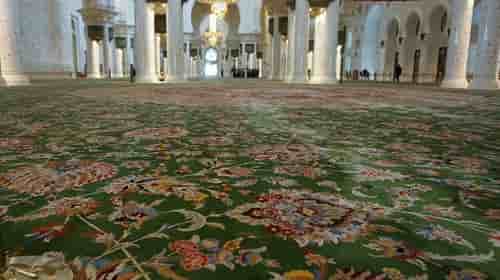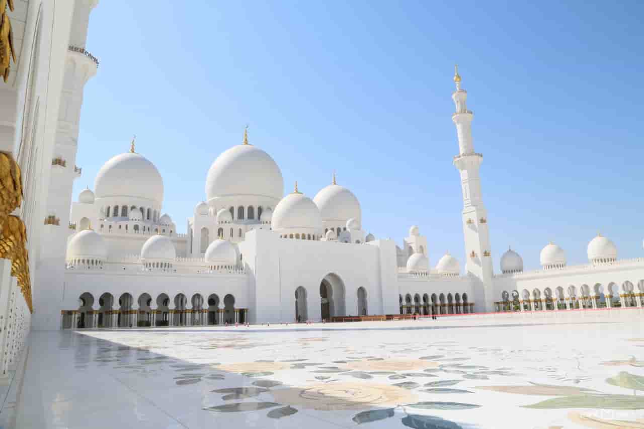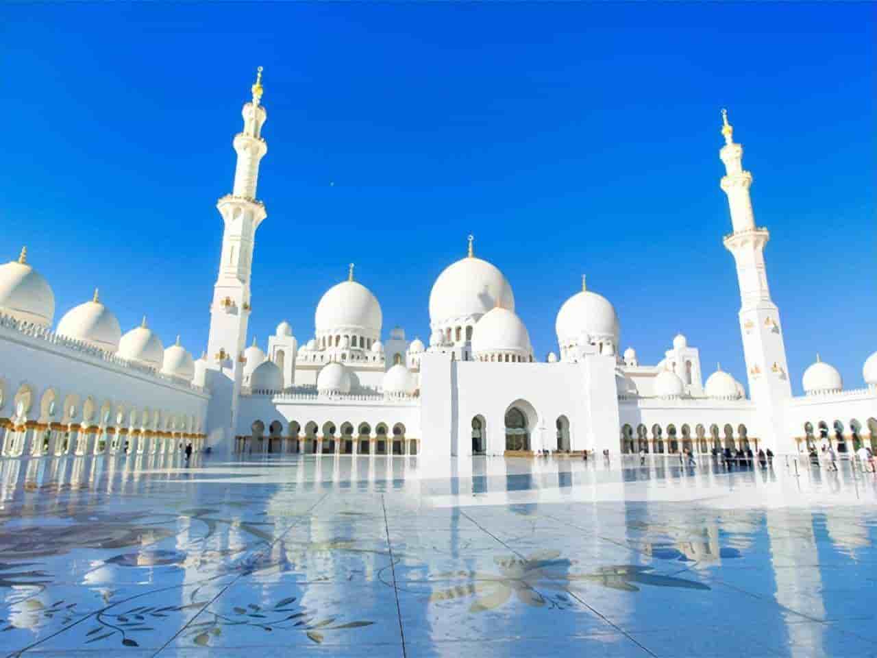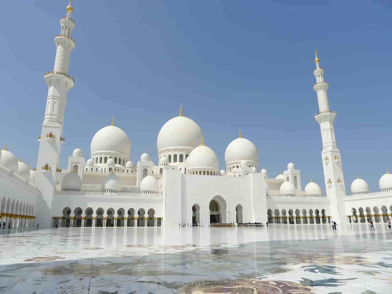 早餐后, 前往世界第三大/阿布扎比最大清真寺【扎耶德清真寺】(入内)该清真寺是为已故老国王扎伊德所建,内有以数以万计的宝石向前的水晶珠宝吊灯,【全世界最大手工地毯】,整个建筑群使用希腊的玉石包裹,白色典雅格外庄严肃穆(因开放与关闭时间比较特殊,若抵达时属关闭时间,则安排外观,约 20 分钟);