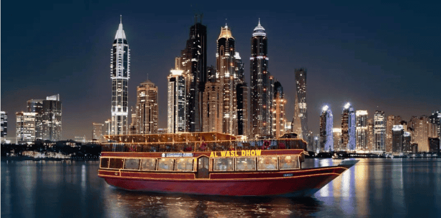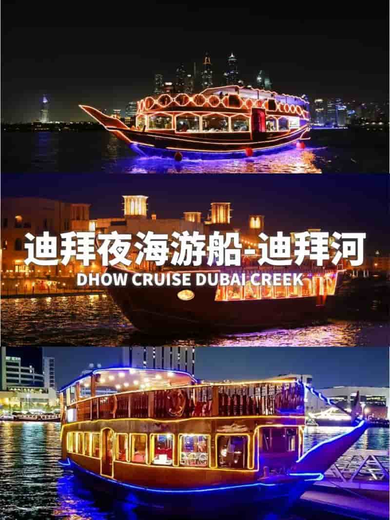 【夜海游船】乘阿拉伯海湾风格的木质游船沿着迪拜的内海湾航行,一览迪拜两岸灯火通明、五光十色的夜景,欣赏动听迷人的阿拉伯民族乐曲