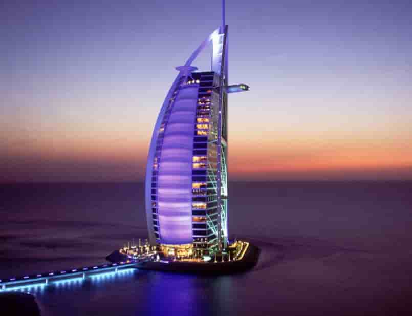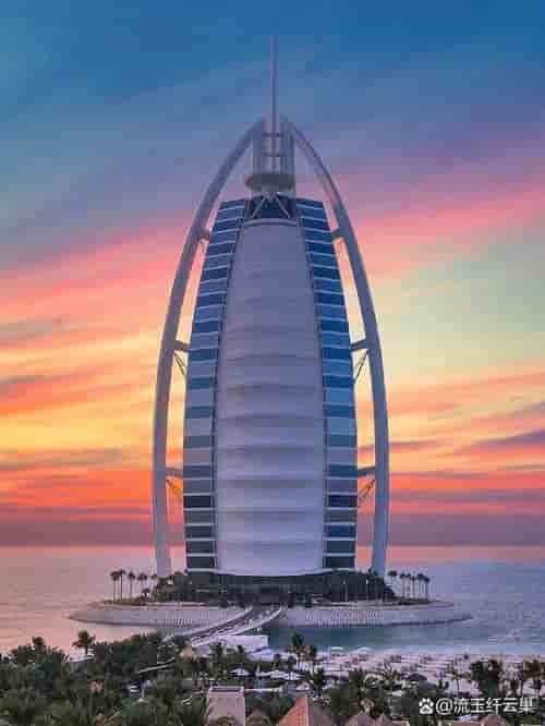 ▲ 外观欣赏世界瞩目的用 24 吨黄金装饰的海上阿拉伯神殿【7 星级阿拉伯塔酒店】(又名:帆船酒店),曾是全球最高的酒店,比法国艾菲尔铁塔还高上一截,堪称建筑杰作,是阿联酋奢侈的代表。