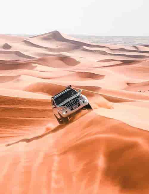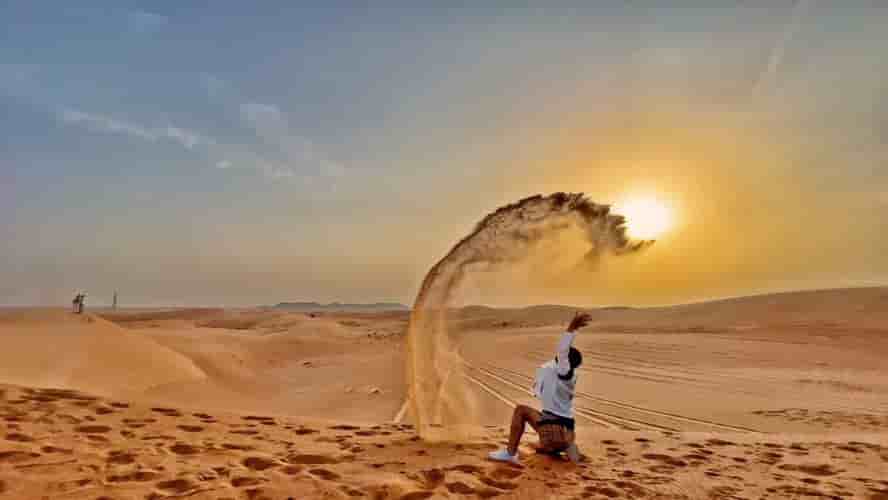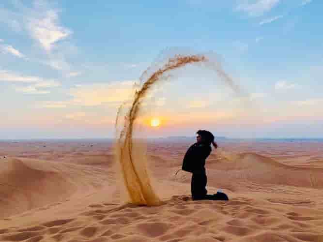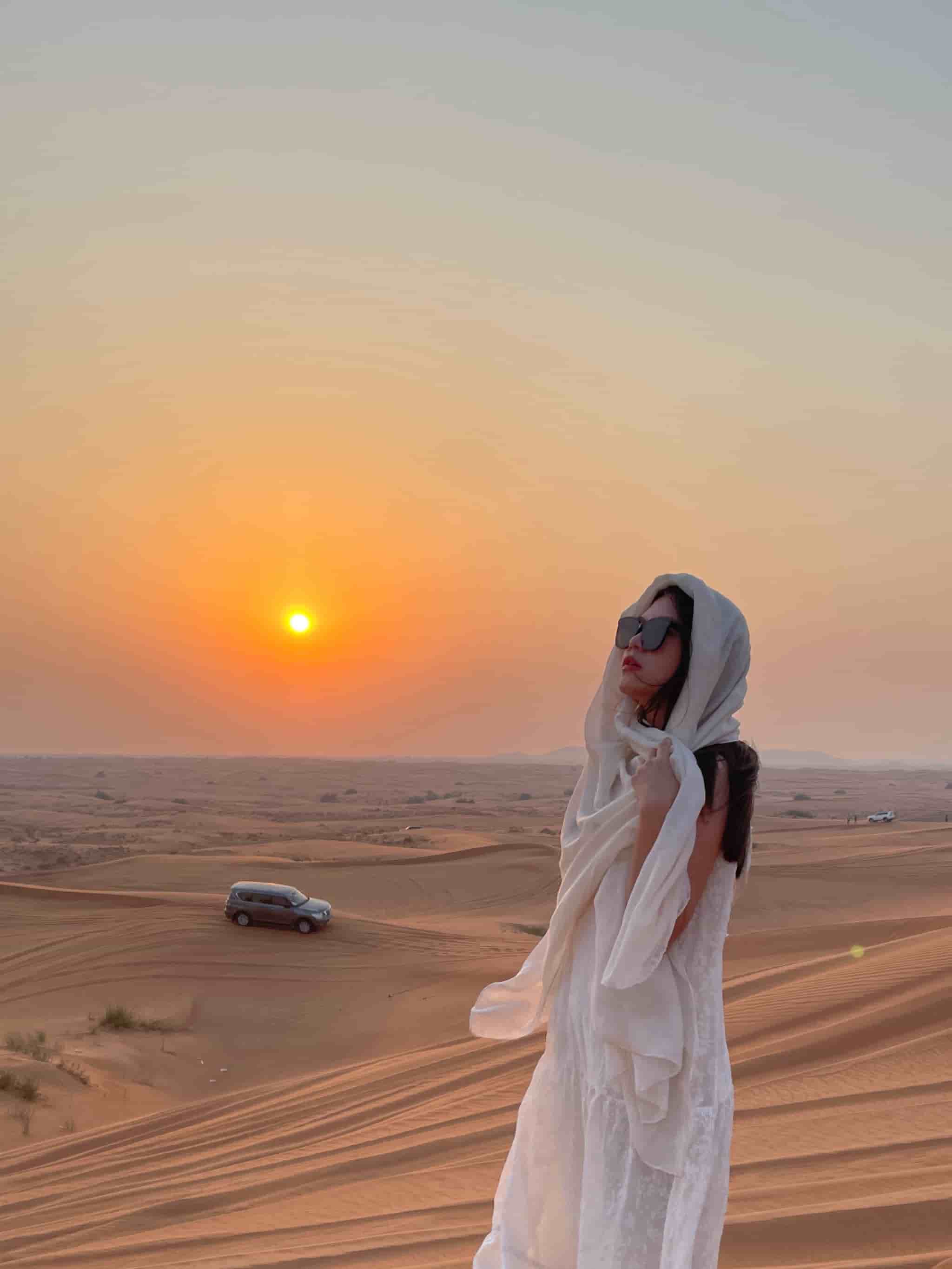 下午前往【沙漠冲沙】:乘坐四驱越野车进入迪拜自然保护区感受沙漠冲沙,技术高超的司机 将带您体验精彩刺激的震撼之旅,在夕阳西下的落日景象中,载您起伏于高低不同的沙丘之 上,并特别赠送阿拉伯传统服饰“换装秀”,在这个坐落于喧闹都市中的静谧渔村中,您可以 换上风格迥异的阿拉伯传统服装,留下自己最值得记忆的阿拉伯风情纪念。千万别错过这个 绝佳的摄影机会,它会给您的旅程留下美好的回忆;同时参加传统阿拉伯风情篝火露营,在 营地品尝阿拉伯烧烤,在月光下、篝火边欣赏阿拉伯民族舞蹈-肚皮舞表演并可与舞娘共舞, 还可以享受阿拉伯风格的骑骆驼,传统纹身(可褪去),活动结束送回酒店休息。