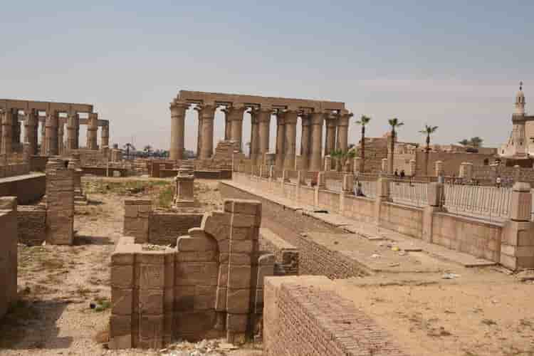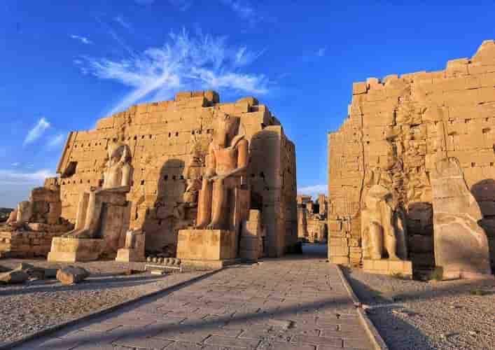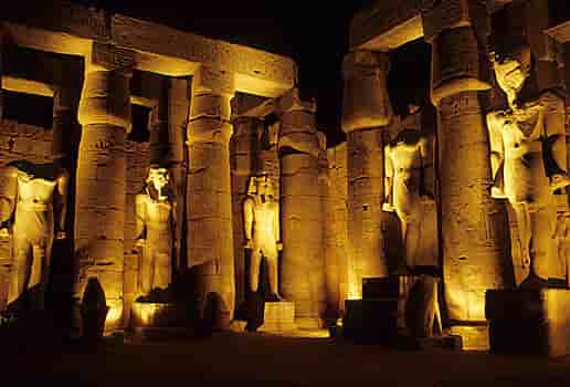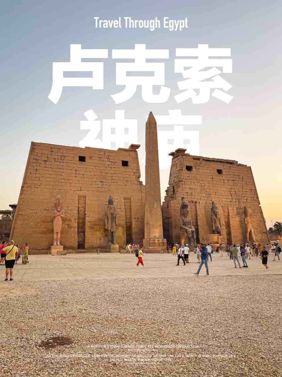 然后游览位于尼罗河东岸的【卢克索神庙】(外观):正门前的狮身人面像大道、方尖碑、塔门、法老雕像和墙壁上的浮雕、拉美西斯二世大院里的雕像和廊柱、阿蒙霍特普三世阳光庭院的柱廊。