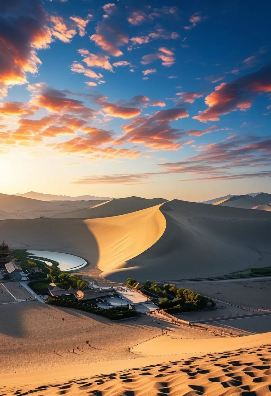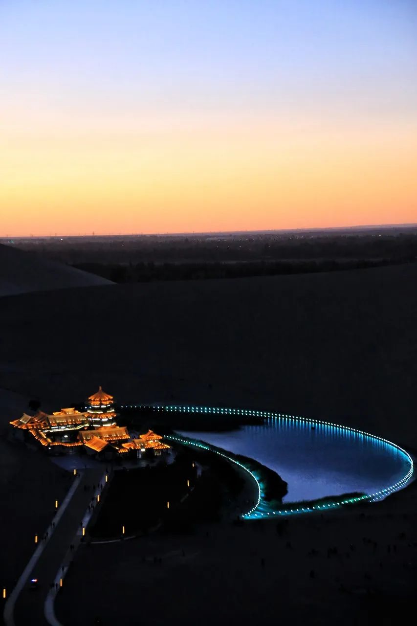 都说水火不相融,可在这神奇的世间,却唯有水能够将火一般炽热、粗犷的沙漠变得那般温柔细腻。月牙泉和鸣沙山,它们就像是一对形影不离、相辅相成的亲密伴侣,二者相互依偎,共同构成了这片沙漠中最浪漫、最令人心驰神往的奇妙景致。你看那木质的阁楼,之间有连廊巧妙地连接着,组合成了一个个精致小巧的院落,宛如沙漠中的世外桃源一般。而那柔情似水的月牙泉,与这精巧的小院落相互映衬,恰似给那粗犷豪放的沙漠,轻轻地点上了一抹别样的柔美,让整个大漠都多了几分婉约的韵味。到了夜晚,环绕着湖岸的点点灯光依次亮起,就像是一群小精灵,在黑夜中欢快地跳跃着,它们用那柔和的光亮,清晰地勾勒出月牙泉的形状,远远望去,月牙泉就仿佛是天上那弯弯的月牙,一不小心坠落到了这一片浩瀚的大漠之中,美得如梦如幻,让人仿佛置身于仙境一般,沉醉其中,难以自拔。然而,很多人或许都不曾知晓,在那遥远的清朝时期,月牙泉的水量可是十分充沛的呢,水面宽阔得甚至还能行船呢,那场面该是多么壮观。由于气候变得愈发干燥,水土流失的情况也日益糟糕,就像两只无情的大手,一点点地挤压着月牙泉的生存空间。它的水深呀,已经从曾经最深的 10 米,急剧下降至现在的仅仅 2 米了,再加上敦煌湿地面积大幅减少,水资源就像那稀缺的珍宝,变得越来越少,沙漠化的现象更是日趋严重,仿佛一张无情的大网,笼罩着月牙泉。如今呀,能否留住这颗大漠中的明珠,已然变成了一个让人揪心的谜,让人在担忧之余,又满是无奈。