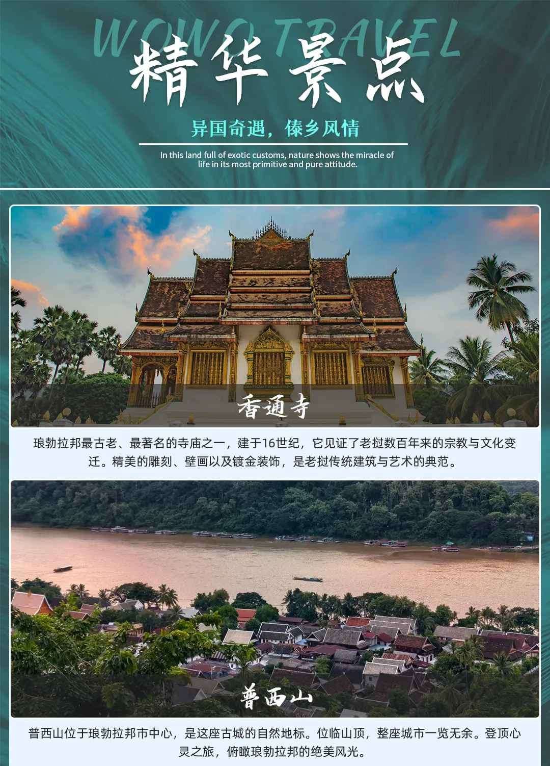 早餐后前往参观【香通寺】是琅勃拉邦最负盛名的寺庙,后殿外墙上是大名鼎鼎的“生命之树The Tree Of Life”吸引了众多游客为之驻足,老挝虔诚的佛教信徒毕生的愿望就是,以能买上一颗宝石镶嵌在这颗树上以此来获得佛祖的庇佑与俗世红尘的荣耀!寺庙中可圈可点之处很多,等待你一一发现。在殿内,装饰华美的立柱支撑着覆有法轮dhammacakka的 房顶。在建筑群的东面附近还有一幢王室的葬仪礼堂,陈列着一辆豪华的12轮的出殡仪仗车和王室成员的骨灰坛。礼堂外墙的嵌板上雕刻着史诗《罗摩衍那》的史诗故事。
