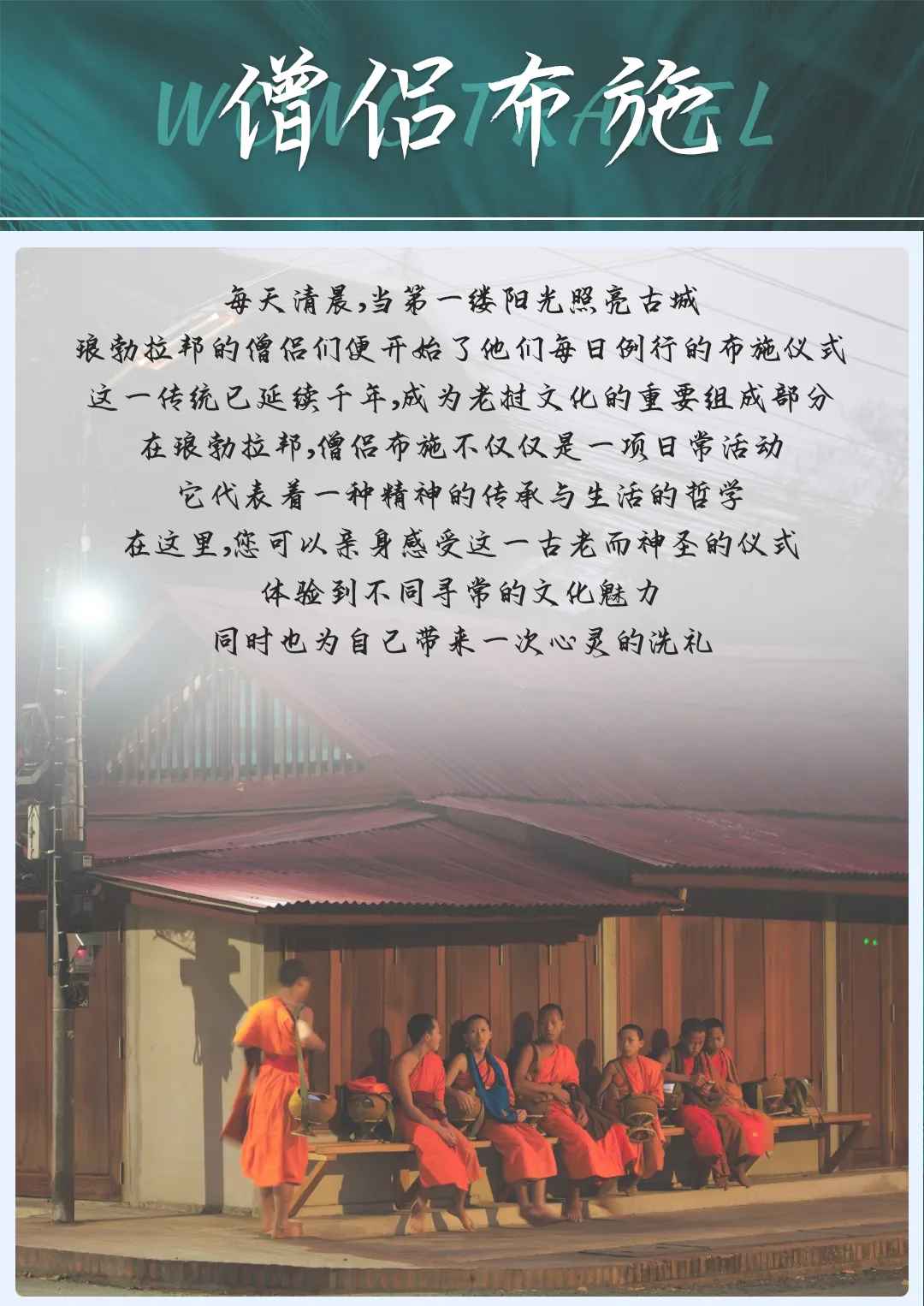 清晨约5:30分左右出发,参加(布施),村上春树的《假如真有时光机》中曾经这样描述琅勃拉邦布施“哪怕只是徒有形式的模仿,只要亲身坚持下去,有朝一日就会变成真的,其间便会有某种超乎预想的东西,让您感受到不知该说是仪式的力量,还是场域的力量。