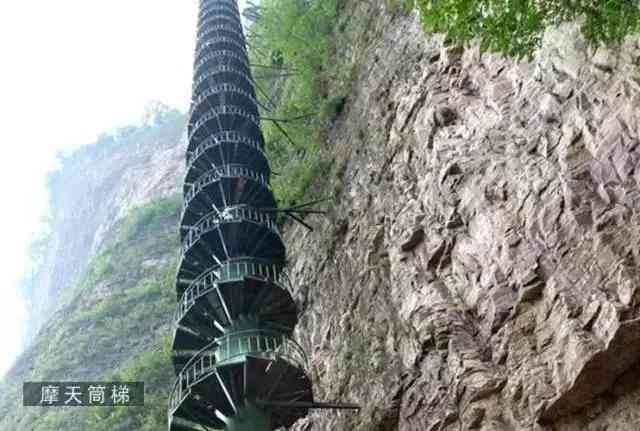 该处钢构为旋梯型设计,高88米,直径3米, 331级踏步,是游客进入下一游览区域的必经之路,游客登梯前行,需要回旋攀登,初行者即使大胆扶栏远观,难免头晕目眩,魂飞魄散,摇摇欲坠如临深渊,此梯是一试胆力的必游之处。