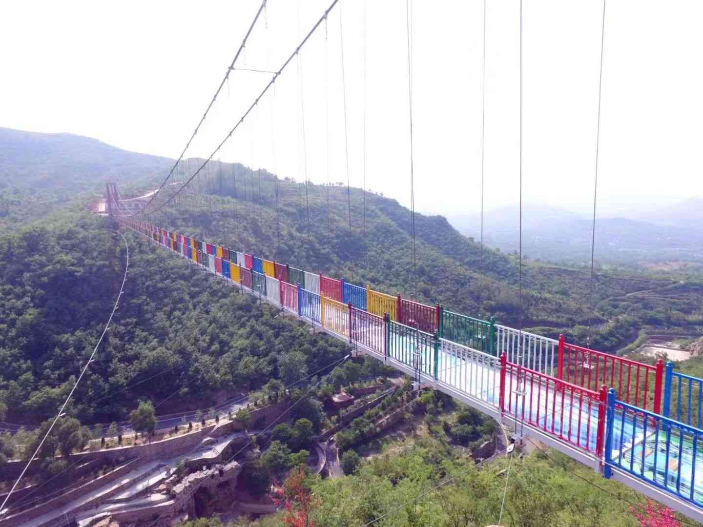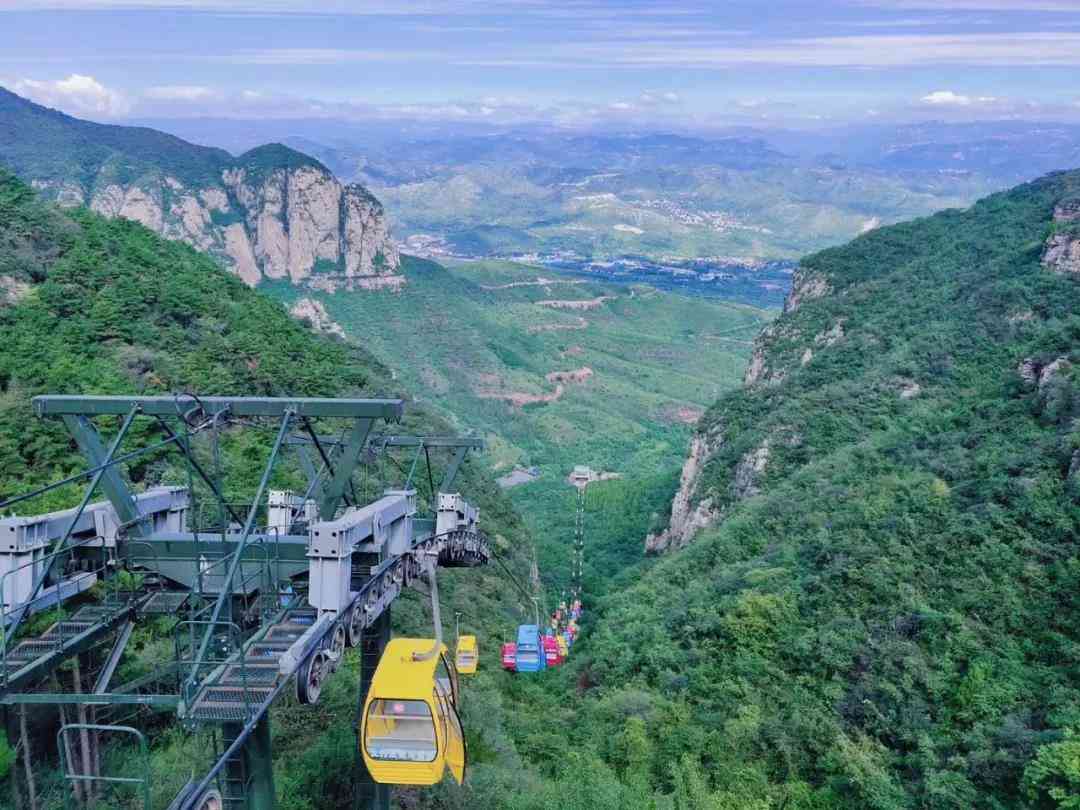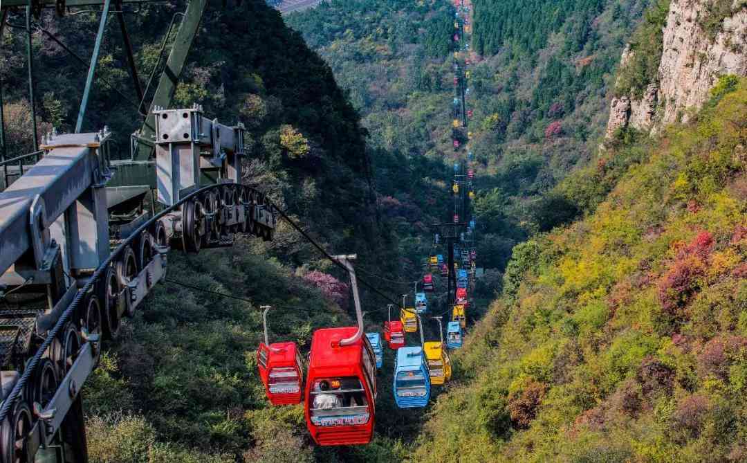 太行五指山景区投资2880万元建设一条单线循环式四人吊箱索道,全长900米,64轿厢,上下站高差约344米,运量约每小时500人,运行速度为每秒一米,线路共有10个支架。