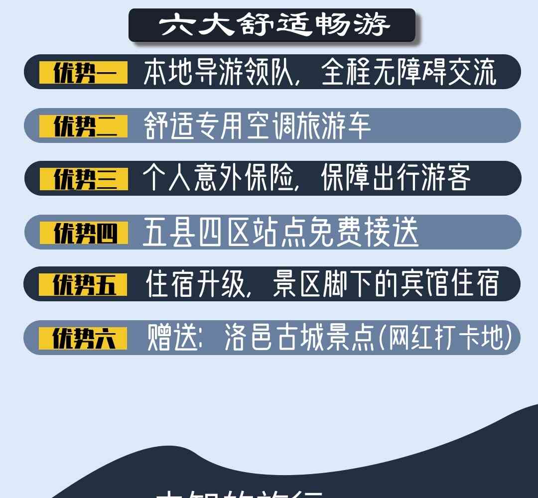 ★提示:在住宿过程中,如产生单人,我社导游有权调整客人入住三人间或双标间加床或单人自补房差