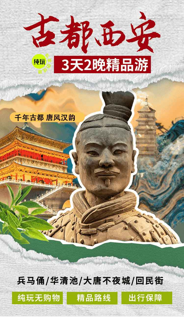 第一天:早乘车赴我国十三朝古都、世界四大文明古都之一【西安】,西安古称“长安”,意为长治久安。游览【钟鼓楼广场】、【回民小吃街】,由北广济街、北院门、西羊市、大皮院、化觉巷等数条街道组成,自由活动。游览【大唐不夜城】,感受大唐长安“唐朝风”贞观之兴、开元之盛,完整展示大唐盛世气象。游览【大雁塔广场】,亚洲最大的喷泉广场和最大的水景广场,水面面积达2万平方米它是亚洲雕塑规模最大的广场,世界最长的光带、世界首家直引水、规模最大的音响组合等多项纪录。后入住。
