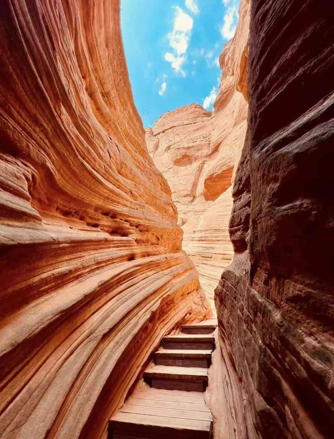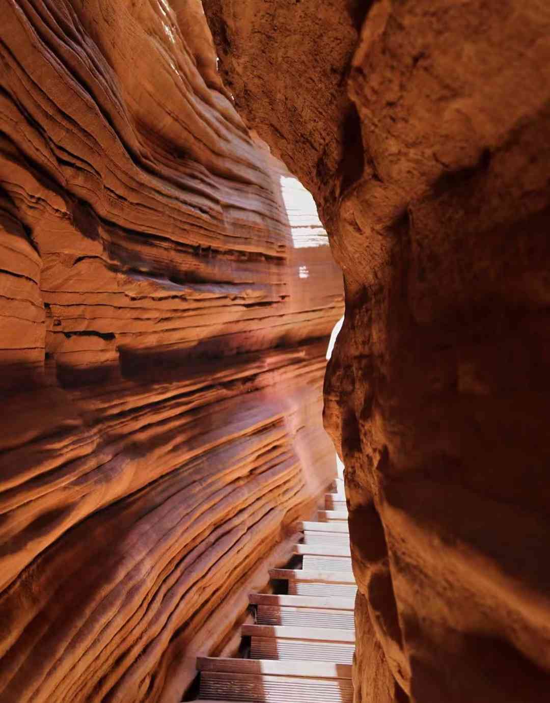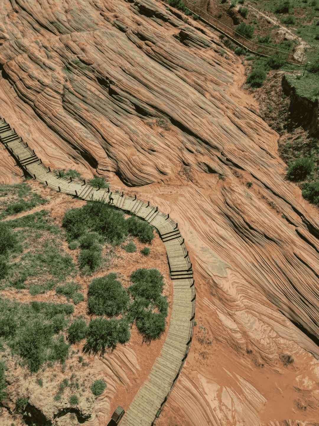 波浪谷景区较大。游览【火焰丹霞】、【赤壁丹霞】和【地心丹霞】三个精华区域环线台阶步道总长度5.8公里,步行约11000步。通过悬索3D玻璃大桥可直达火焰丹霞,节省约1小时游览时间。