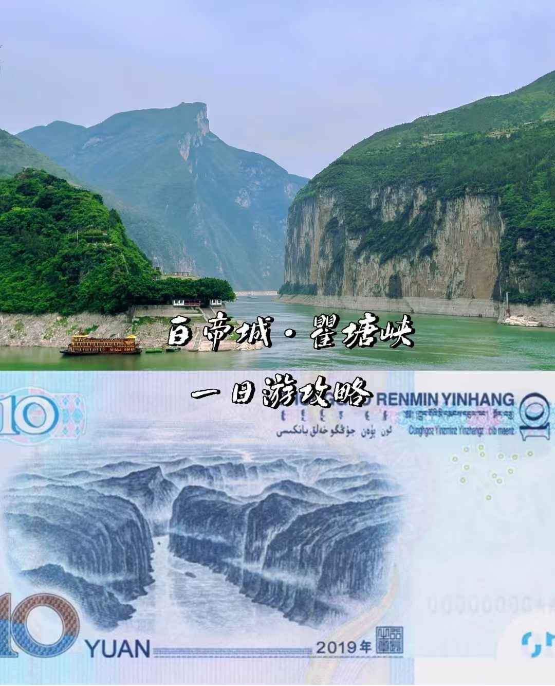 乘车游览10元人民币背景图取景处--夔门 (kuí mén),夔门,又名瞿塘关,两岸高山凌江夹峙,是长江从四川盆地进入三峡的大门。西起重庆奉节县的白帝城,东至巫山县的大溪镇,全长8公里。