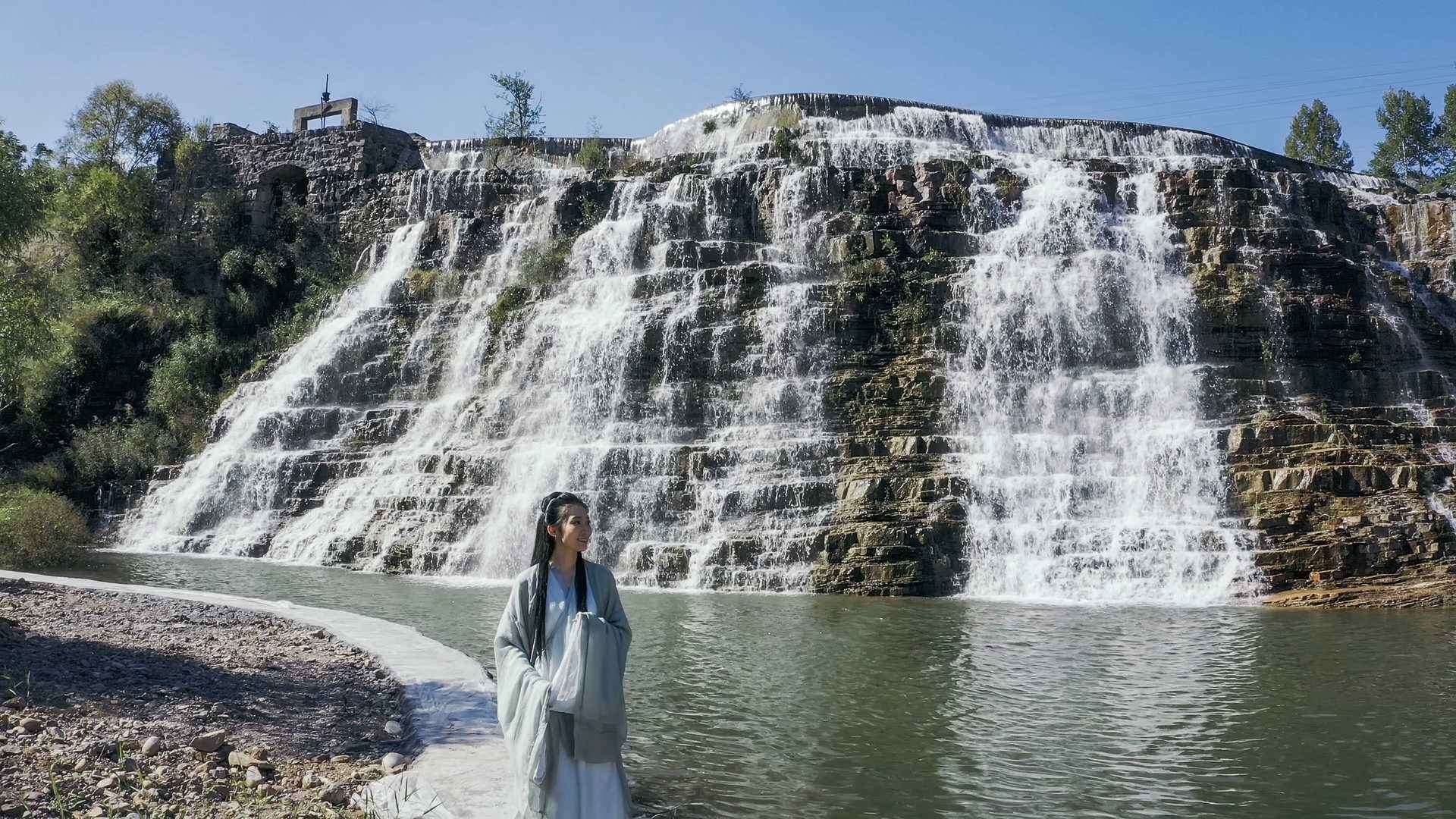 那瀑布从山顶上倾泻而下,仿佛美丽的白色绸缎,从山石之间飘落下来,撞在岩石上。便飞花碎玉般洒满山涧,如烟,如雾,如尘。