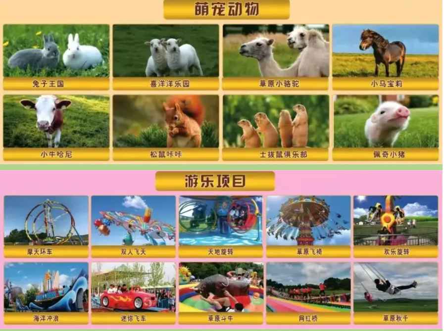 萌宠动物园有:兔子王国,喜羊羊乐园,草原小骆驼,小马宝莉,小牛哈尼,松鼠咔咔,土拨鼠俱乐部等深受孩子们的喜欢!