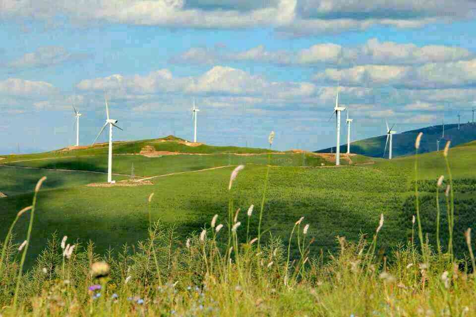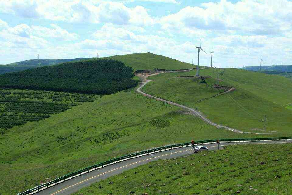 天路是张北坝上的分界线,向下看是坝下的群山连绵,层层梯田,村庄点点,山花烂漫,牛羊成群,风车无限,向上看是辽阔的张北草原,蓝天白云下,一碧千里,而并不茫茫,四面都有梯田,平地是绿的,层层梯田也是绿的,羊群一会儿上去,一会儿又下来,走在哪里都像给无边的绿毯绣上了白色的大花。层层梯田的线条是那么柔美,就像只用绿色渲染,不用墨线勾勒的中国画那样,到处翠色欲流,这种境界,即使人惊叹,又叫人舒服;既愿久立而望,又想低吟一首奇丽的小诗。