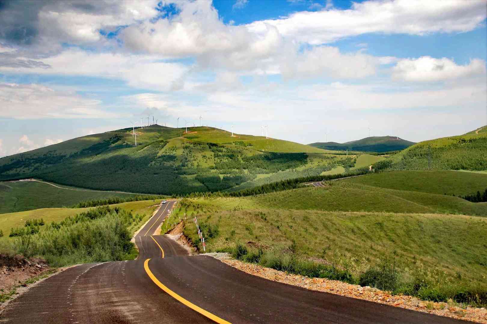 【草原天路—(66号公路)】 草原天路沿线山高坡陡、沟壑纵深、景观奇骏,风车林立,展开一副百里坝头风景画卷,深色柏油路与黄色线本身就是一条美丽的风景,何须春花烂漫,自揽满怀春风。百里之间,左右徘徊曲折,剧烈地跌宕起伏,犹如一条蛟龙,盘踞于群山峻岭之颠,蓝天与之相接,白云与之呼应,行走在天路之上,就像是漫步在云端,故而得名“天路”这里的景色你不会感觉乏味!