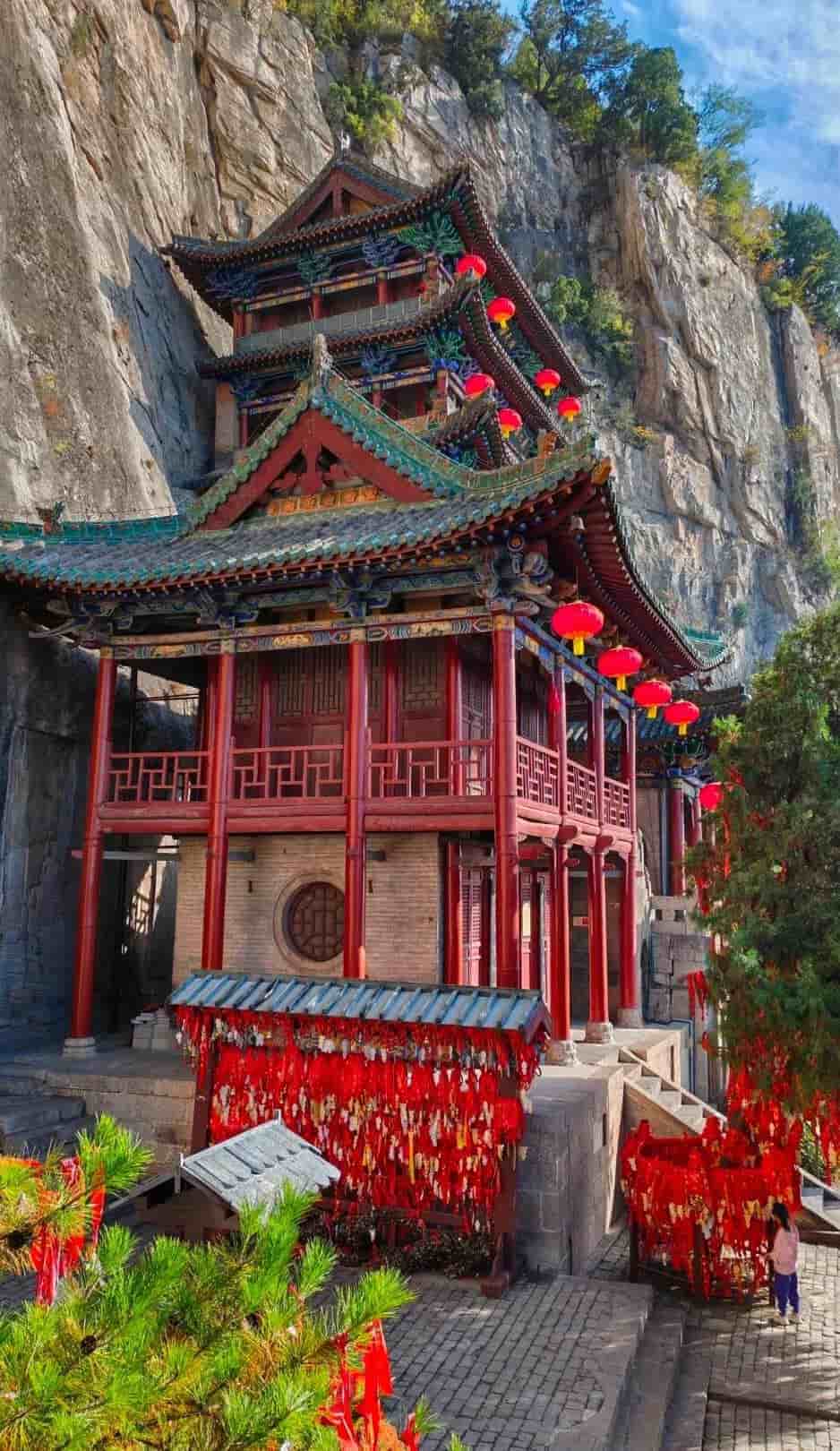 娲皇宫,5A级景区,位于河北邯郸涉县,是我国规模最大的女娲祭祀地。它悬挂在峭壁之上,仅靠九根铁链与崖壁相连,楼体有错动和摆动空间,登临时有摇晃之感是建筑史上动静结合的典范。凭借高超的建筑设计技艺娲皇宫历经无数次地质灾害而屹立不倒,见证了华夏文明的坚韧与传承。