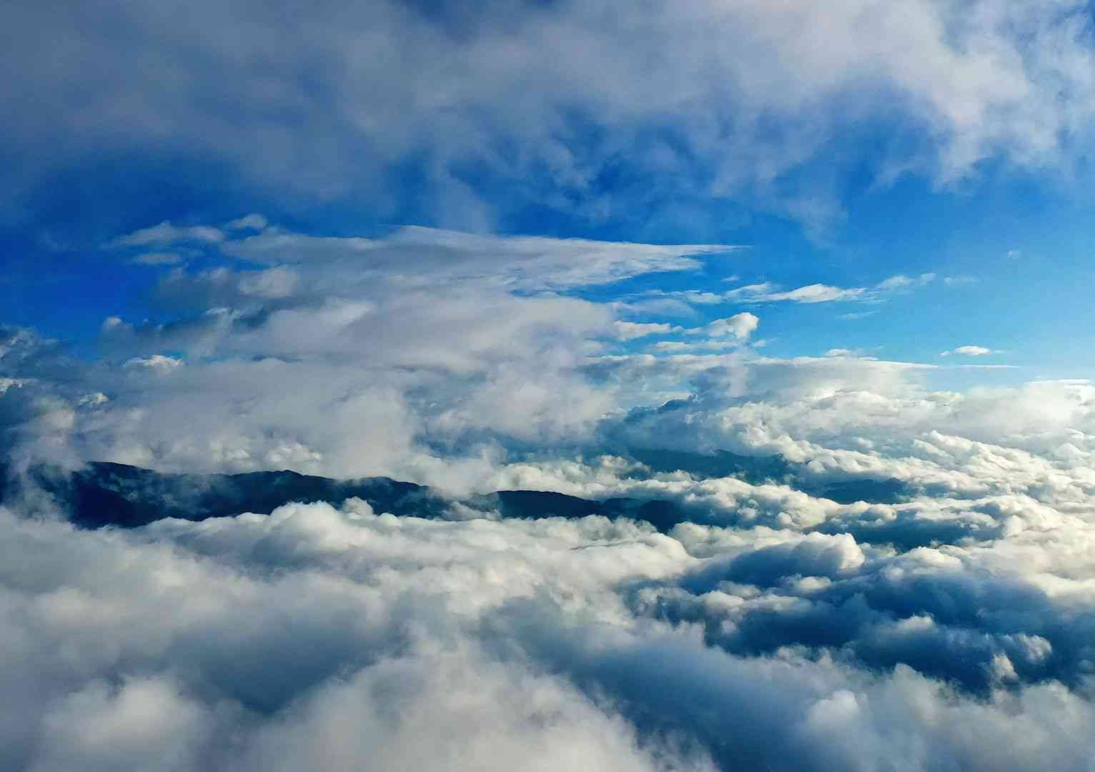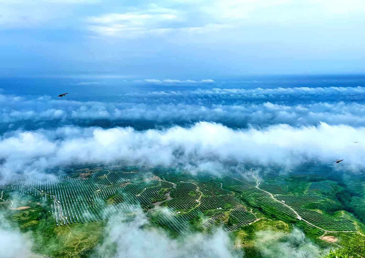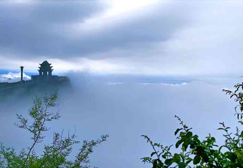 云雾蒸腾,群山若隐若现,云海升腾,如面纱,如海潮。