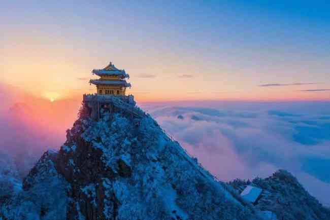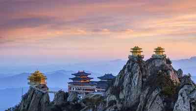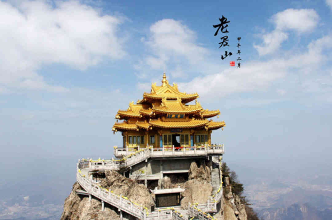 金顶道观群 老君山金顶道教建筑群依托山顶建筑,主要包括老君庙、道德府、五母金殿、亮宝台、玉皇顶、钟鼓楼、南天门、朝阳洞、大道院、神道天桥、回廊等,全部采用明清皇家宫殿式建筑形式,特别是金殿、亮宝台、玉皇顶的三座金顶,成为老君山道观群的亮点。
