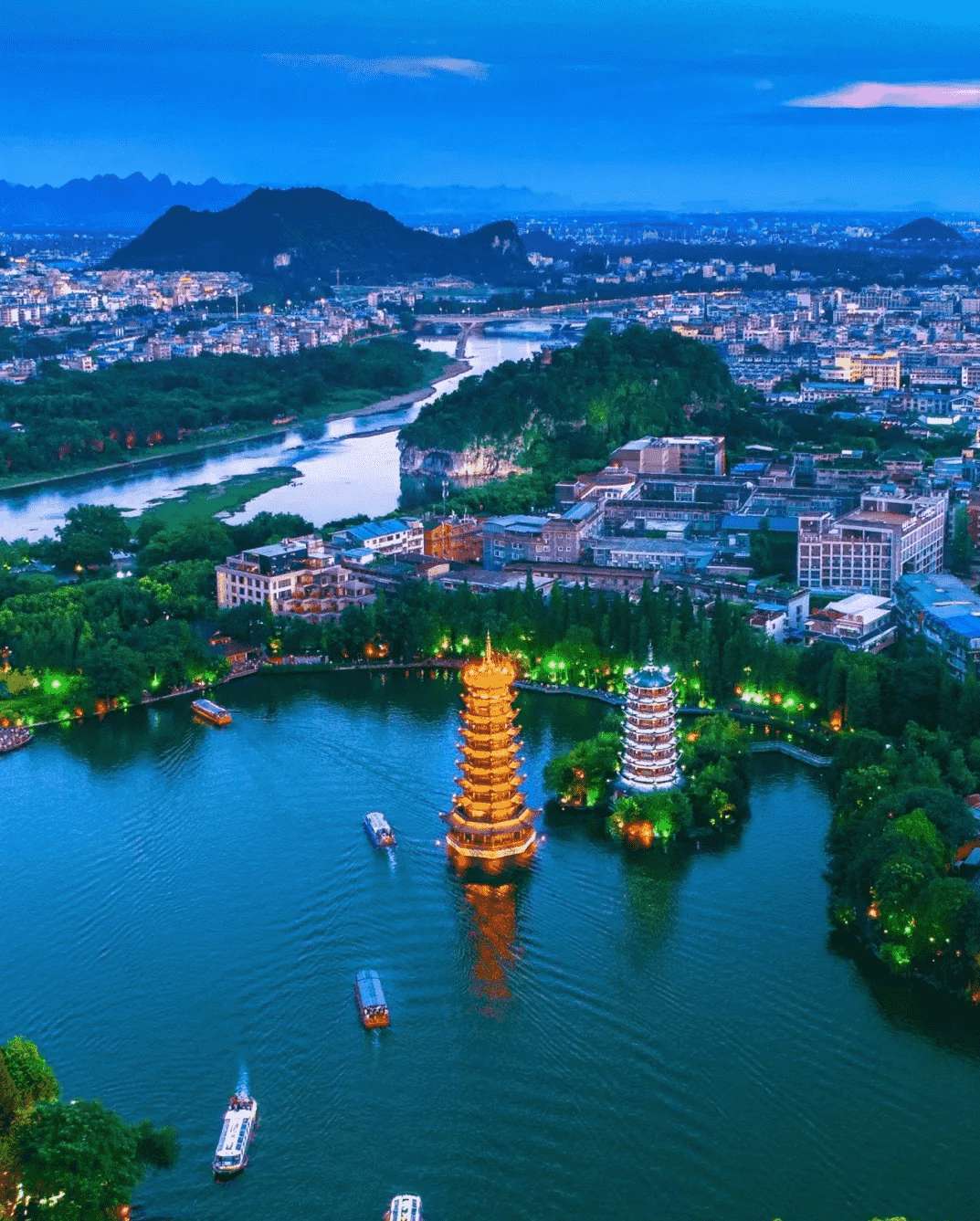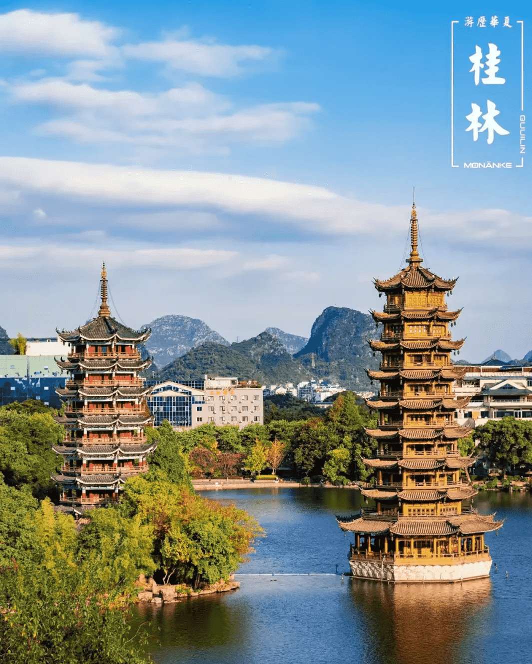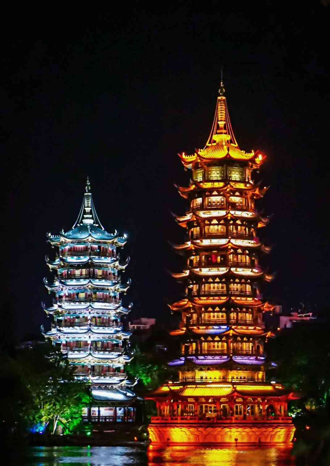 外观【日月双塔】座落在桂林城的中轴线上 ,与象山上的 普贤塔、塔山上的寿佛塔 ,相互呼应 ,相互映衬,有“ 四塔同美”之说 ,是两江四湖环城水系中最著名的旅游景点。整座铜塔创下了吉尼斯三项世界之最:世界上最高 的铜塔 ,世界上最高的铜质建筑物,世界上最高的水中塔 。