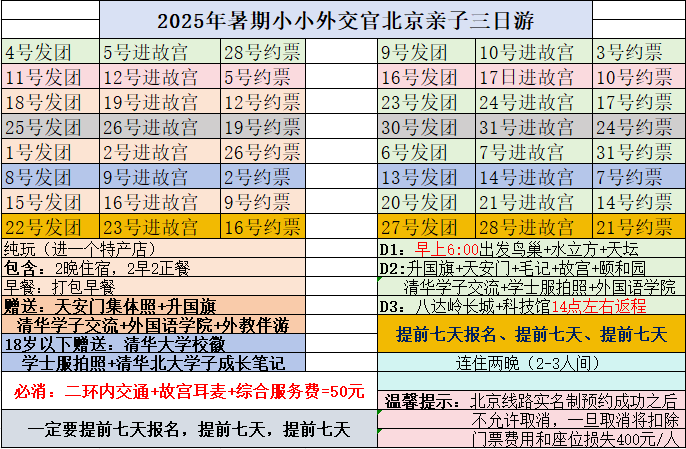 提示:北京线路实名制预约成功之后不允许取消,一旦取消将扣除门票费用和座位损失398元/人